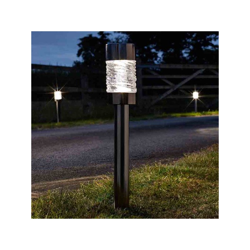 Balise solaire éclairante à planter le long des allées, bordures et massifs. Se recharge au soleil et s'illumine automatiquement la nuit, luminosité de 5 Lumens. Le plateau en verre est amovible pour servir également de lanterne de table. Coloris en nickel noir, inox et verre -57 x 7.5 cm