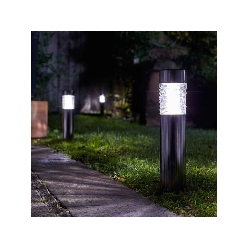 Balise solaire en acier inoxydable brossé Le verre renforcé optimise la dispersion de la lumière Éclairage super brillant de 10 lumens Il suffit d'enfoncer le pic dans un sol mou pour la mettre en place Durée de fonctionnement minimale de 6 heures et plus Charge en plein soleil. Illumine automatiquement la nuit