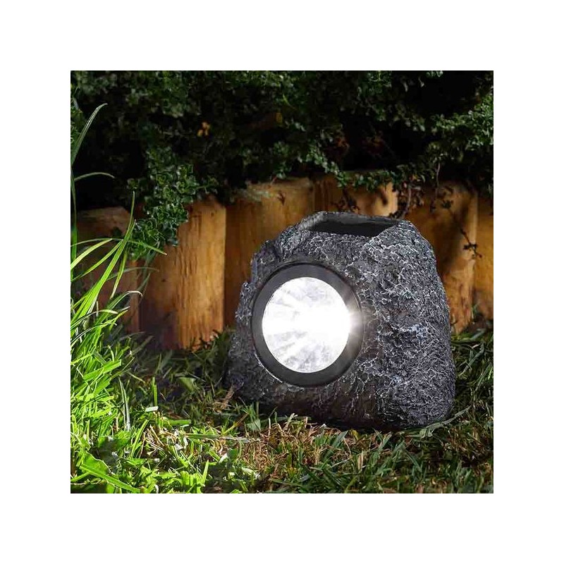 Carry Pack de 4 spots solaires Rocher effet granit. Luminosité de 3 lumens. A poser le long des allées ou pour éclairer des massifs. Se recharge au soleil et s'allume automatiquement à la tombée de la nuit.