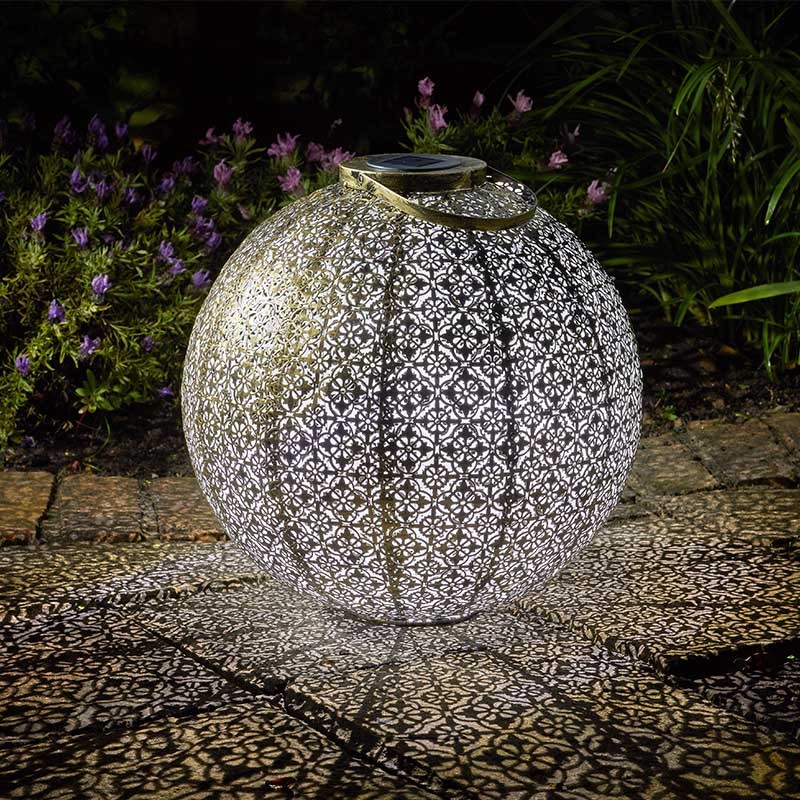 Lanterne solaire en fer, ambiance orientale. A poser ou suspendre. Se recharge au soleil et s'allume automatiquement la nuit. Coloris doré