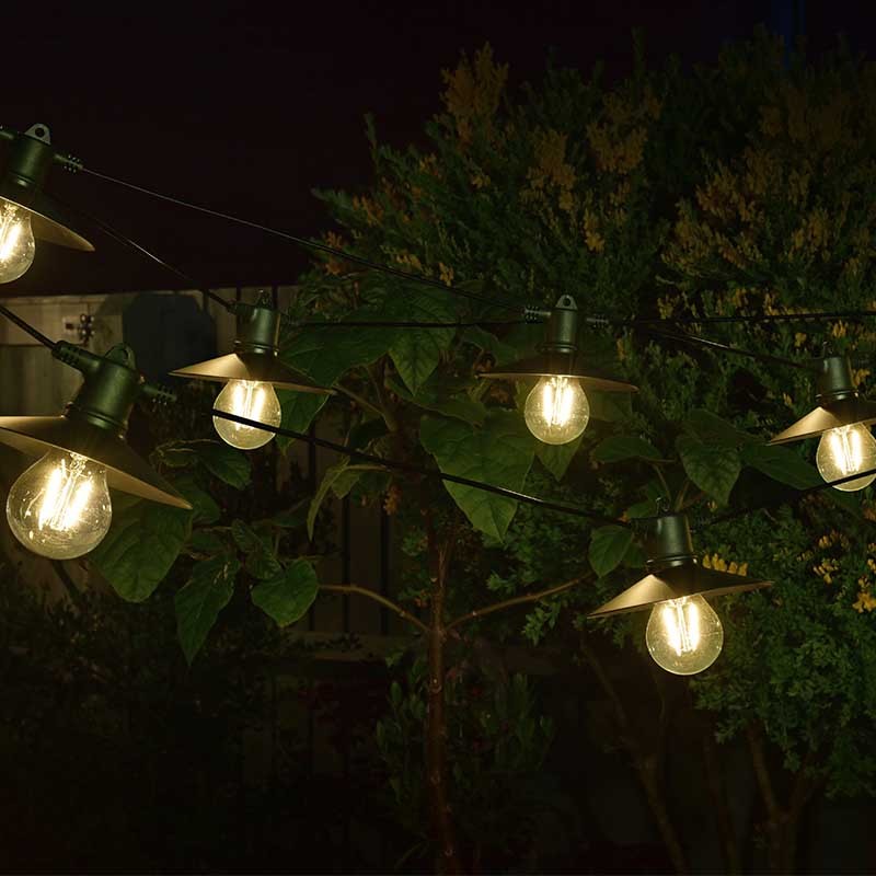 Guirlande solaire à accrocher à une branche ou une pergola. 20 lumens. 8 ampoules en verre avec LED blanc chaud. Fonctionne avec la nouvelle technologie d'auto-ajustement de la luminosité: 365 Solar qui permet d'adapter la luminosité en fonction de l'ensoleillement de la journée pour un éclairage optimisé 365 jours par an. Longueur: 5.5m, diamètre ampoule: 11.6cm, - plastique et verre