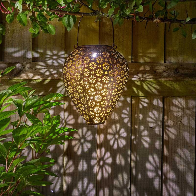 Lanterne solaire à suspendre. Crée un superbe effet de silhouette lorsqu'elle est allumée. Charge au soleil et s'allume à la tombée de la nuit.