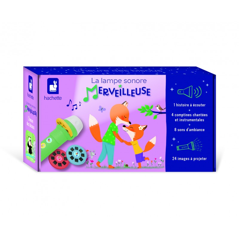 Ainsi font font font les petites marionnettes! La lampe sonore merveilleuse L'heure des bisous est 2 en 1 : c'est un projecteur d'images et une conteuse sonore ! Elle contient 1 histoire de 133 secondes (Je t'aime tant), 4 comptines et leur version instrumentale de 232 secondes (Ainsi font font font, Mon petit lapin, Les petits poissons, Dodo, l'enfant do) ainsi que 8 sons sur le même thème d'une durée de 126 secondes (Battement de coeur, bisous, berceuse, rires d'enfants, petite forêt avec ruisseau et oiseaux qui sifflent, ronron du chat, mélodie au piano, deux rossignols). La durée sonore totale est de 491 secondes. La boîte contient une lampe, 3 rondelles qui correspondent chacune aux 3 boutons de la lampe et contenant 8 images, ainsi qu'un pochon de rangement en coton. La lampe fonctionne grâce à 2 piles AAA, non incluses. Cette lampe peut être utilisée en autonomie ou accompagnée d'un parent au moment du coucher. idéale pour les enfants dès 3 ans.