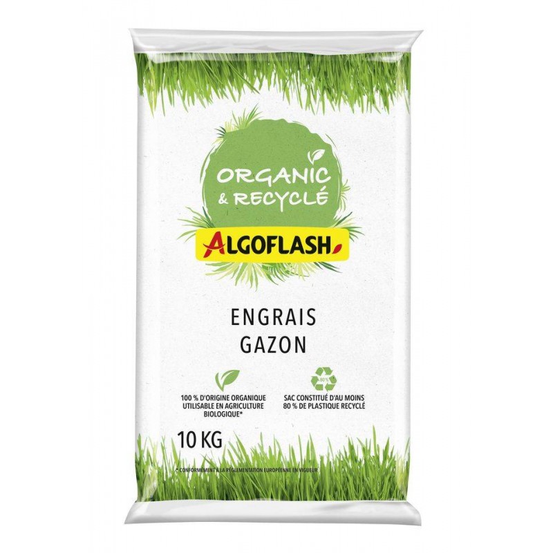 ??Engrais organique complet adapté au gazon. Fertilise et participe à la bonne croissance du gazon. Emballage composé à 80 % de plastique recyclé. Composé de sous-produits d'industrie dont des résidus de coques de cacao. Label Produit Naturel. Utilisable en Agriculture Biologique*.|MENTIONS OBLIGATOIRES: NPK 9.4.3 à base de tourteaux végétaux.-