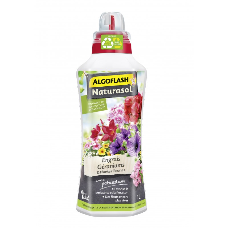 Engrais liquide toutes fleurs et géraniums. Apport des éléments nutritifs nécessaires à la croissance et l'épanouissement des fleurs. Utilisable en Agriculture Biologique*.