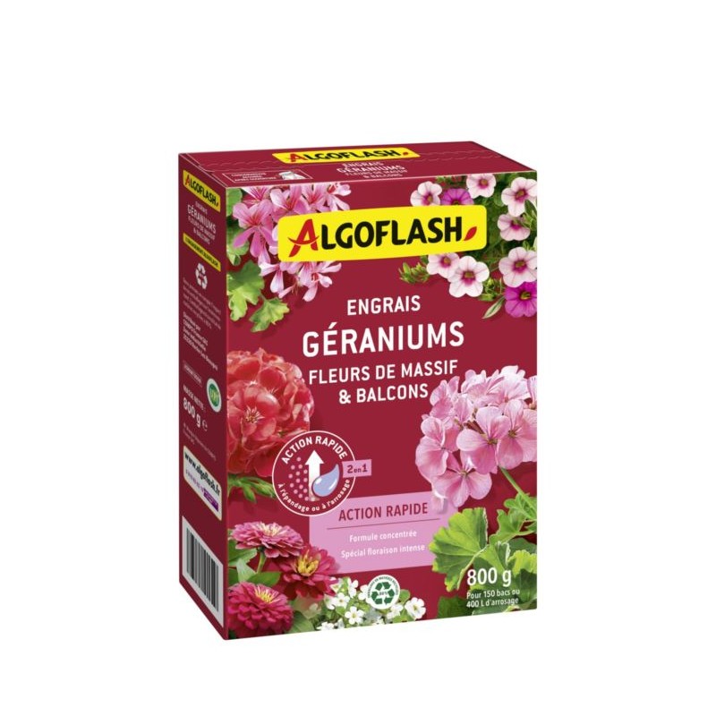 Granulés à épandre ou à diluer, 100% soluble. Intensifie la floraison des géraniums et plantes à massifs.|MENTIONS OBLIGATOIRES: NPK (CaO MgO SO3) 16.6.10 (7,2 4,5 14) avec oligo-éléments-