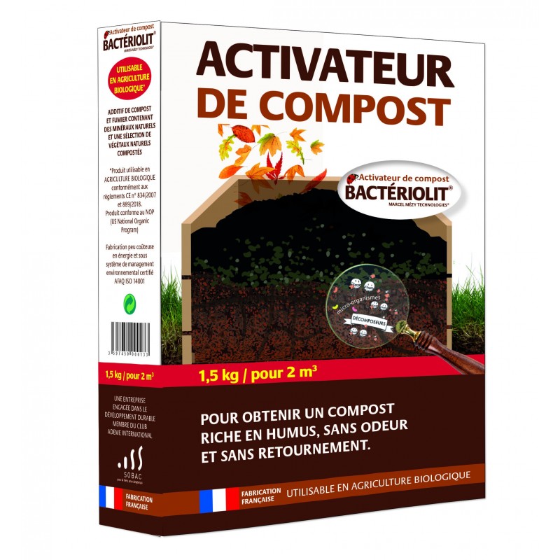 L'activateur de compost BACTÉRIOLIT est unique ; il ensemence vos composts en micro-organismes aérobies indispensables à la réussite d?un bon compost. Riche et sans odeur de pourrissement, le compost offre ainsi une grande qualité fertilisante et structurante pour tous les sols. Les micro-organismes de BACTÉRIOLIT ont la particularité de transformer rapidement les déchets ménagers organiques en humus. Cette action naturelle permet d?obtenir un compost aéré, sans avoir à le brasser.