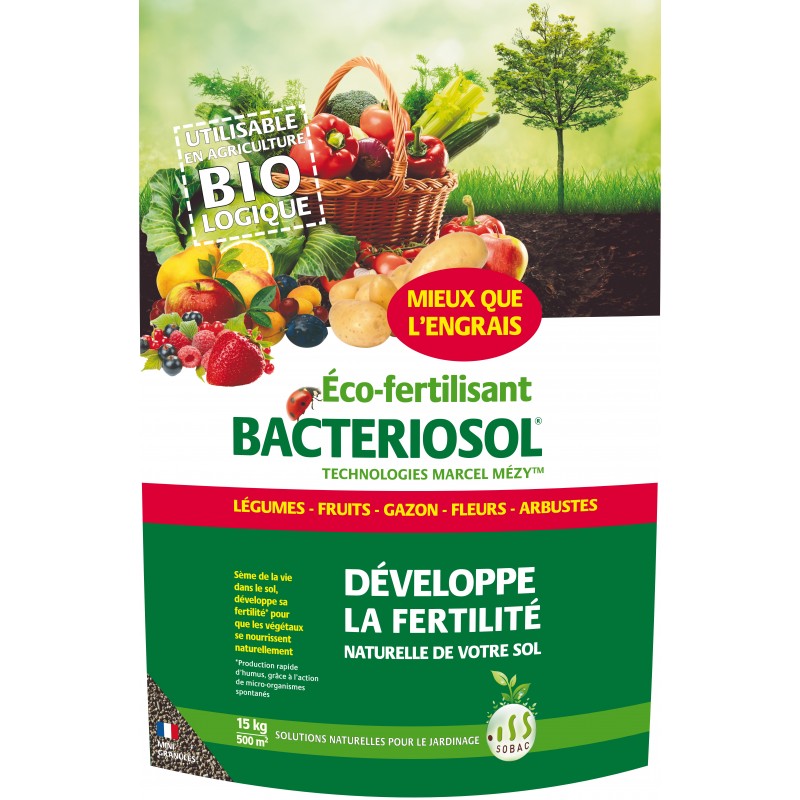SEME LA VIE DANS LE SOL POUR NOURRIR LE POTAGER, LES FRUITIERS, FLEURS ET ARBUSTES. BACTÉRIOSOL EST LE FERTILISANT UNIVERSEL QUI VOUS GARANTIT DES VEGETAUX QUI RESPIRENT LA SANTÉ. ACTION 100 % NATURELLE ET EFFICACE, DES RENDEMENTS ET DES SAVEURS, POUR TOUS LES SOLS ET POUR TOUTES LES PLANTATIONS. Issu des technologies inventées par Marcel Mézy, BACTERIOSOL est un fertilisant professionnel exceptionnel utilisé par des milliers d'agriculteurs depuis de nombreuses années. Il est aujourd'hui au service des jardiniers. Son action est efficace et naturelle. Elle garantit les rendements et les saveurs tout en améliorant la structure du sol. La technologie utilisée est basée sur un procédé capable de produire rapidement de l'humus sur tous les types de sols et sous tous les climats. BON POUR LA PLANETE : En réduisant les nitrates dans les légumes et dans l'eau, BACTERIOSOL contribue à la santé alimentaire et à la qualité de l'environnement. Son pouvoir de fixer le carbone permet de réduire les émanations de CO2 et de protéger également la couche d'ozone. Le sol est plus résistant aux attaques extérieures, excès ou manque d'eau. Il sera moins engorgé d'eau au moment des fortes pluies et permettra de faire des économies d'arrosage en période de forte chaleur. Même entamé, le produit conserve toutes ses propriétés dans son sac d'origine entreposé dans un endroit sec, à l'abri de la pluie et du soleil. L'éco-fertilisant ne brûle pas les végétaux et ne présente pas de dangerosité tant pour l'Homme, les animaux que pour l'environnement. Fabrication française. Utilisable en agriculture biologique.