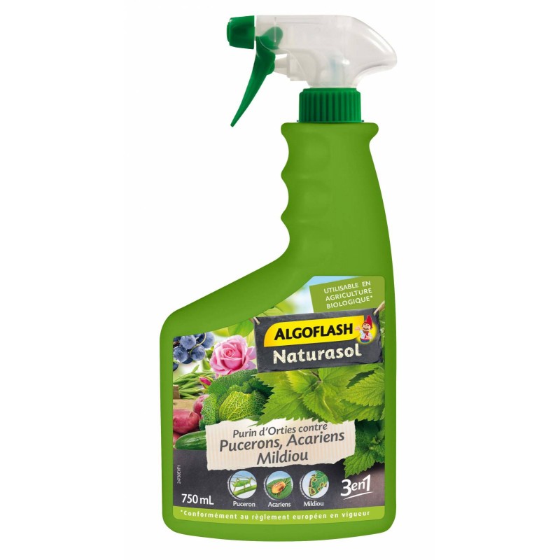 Purin d'orties 3 en 1 contre pucerons, mildiou et acariens. L'ortie (Urtica spp.) est une substance de base utile à la protection des plantes contre les maladies fongiques telles que mildiou, alternariose ou les insectes ravageurs : Pucerons, Carpocapses, Altises, Teignes…) et les Acariens. Très polyvalent et prêt à l'emploi, le purin s’utilise en pulvérisation sur toutes les plantations du jardin (Potager, Arbres fruitiers, Plantes ornementales…). Le purin d’orties renforce les défenses immunitaires des végétaux, les protège, en préventif contre les maladies et limite les insectes et acariens.|MENTIONS OBLIGATOIRES: