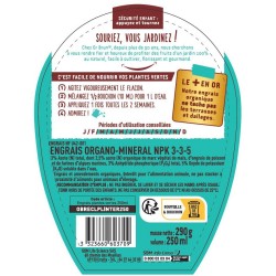 COMPOSITION: Engrais organo-minéral NPK 3-3-5. 3% Azote (N) total, dont 2,5% azote (N) organique de marc végétal de maïs, d'engrais de poisson et de farines d'algues marines. 3% Anhydride phosphorique (P2O5) total. 5% Oxyde de potassium (K2O) soluble dans l'eau.