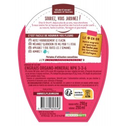 COMPOSITION: Engrais organo-minéral NPK 3-3-6. 3% Azote (N) total, dont 2,5% azote (N) organique de marc végétal de maïs, d'engrais de poisson et de farines d'algues marines. 3% Anhydride phosphorique (P2O5) total. 6% Oxyde de potassium (K2O) soluble dans l'eau.