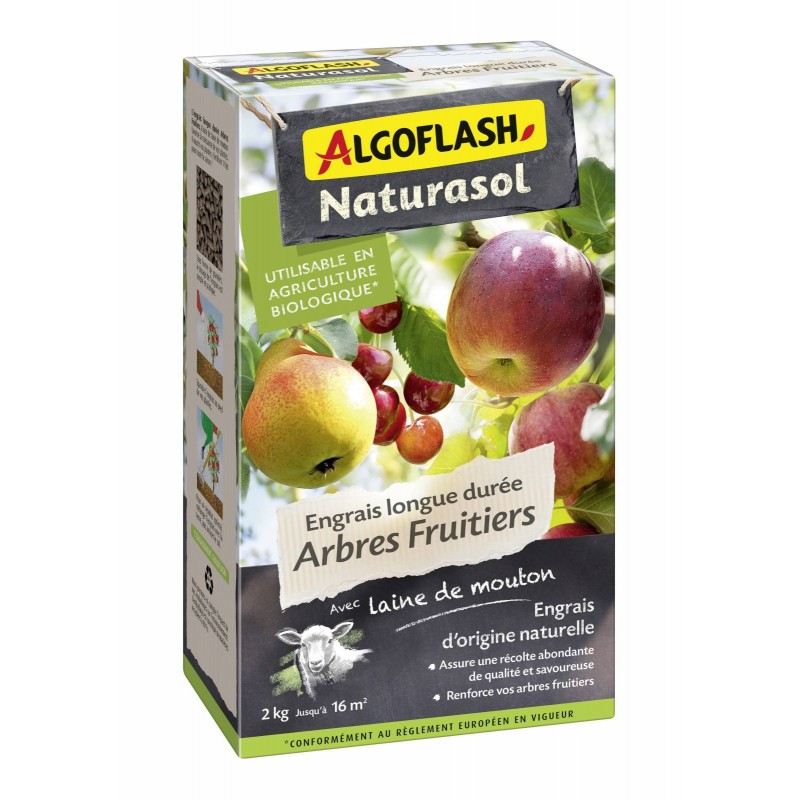 Engrais à base de 50% de laine de mouton. Favorise la croissance des arbres fruitiers. Nourrit vos plantes pendant 5 mois. Action rétention en eau. Label produit naturel. Utilisable en Agriculture Biologique*.|MENTIONS OBLIGATOIRES: NPK 6.3.5 + 50 % laine de mouton.-