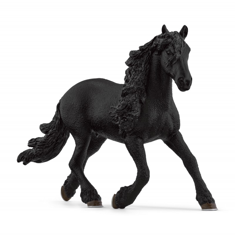 Cet étalon noir est vraiment majestueux. La race des chevaux Frison est caractérisée par sa robe brillante aussi noire que la nuit. Avec sa haute stature et sa longue crinière. il a fière allure lorsqu’il est attelé à une calèche. Mais il est surtout apprécié comme cheval de dressage ::