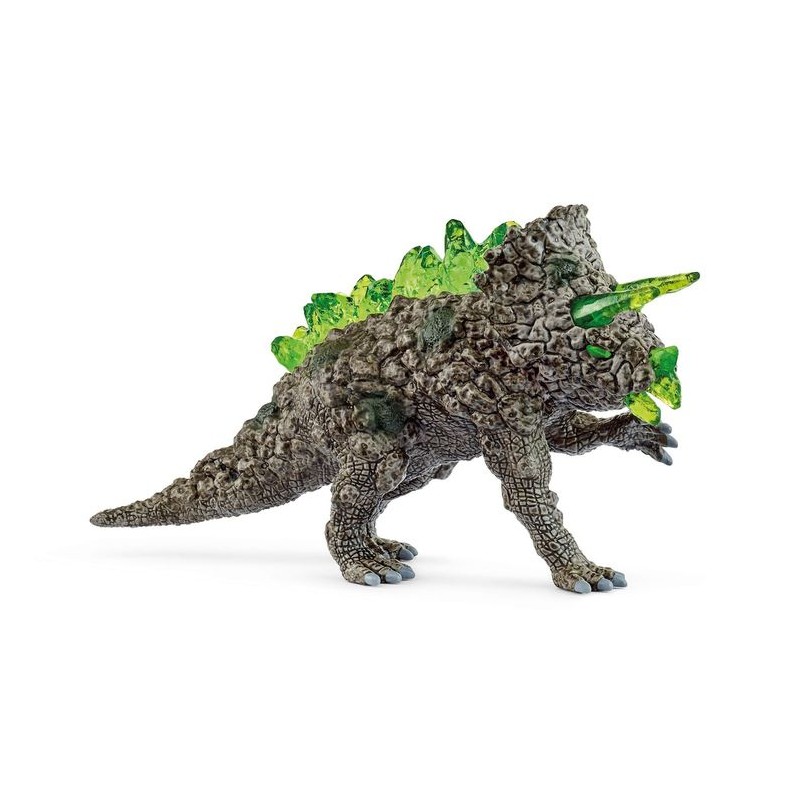 Les yeux verts du Tricératops de Pierre scintillent d’un air menaçant dans l’obscurité de la grotte. Voilà un prédateur qui fait froid dans le dos ! Il pousse un grondement de colère. C’est étroit ici et son crâne imposant l’empêche de se déplacer facilement. Il ne lui reste plus qu’à fuir droit devant ! Il baisse sa grosse tête pour attaquer et prend son élan. Il faut vite partir avant qu’il ne frappe avec les trois cornes en cristal acérées sur sa tête. Sauve qui peut !|