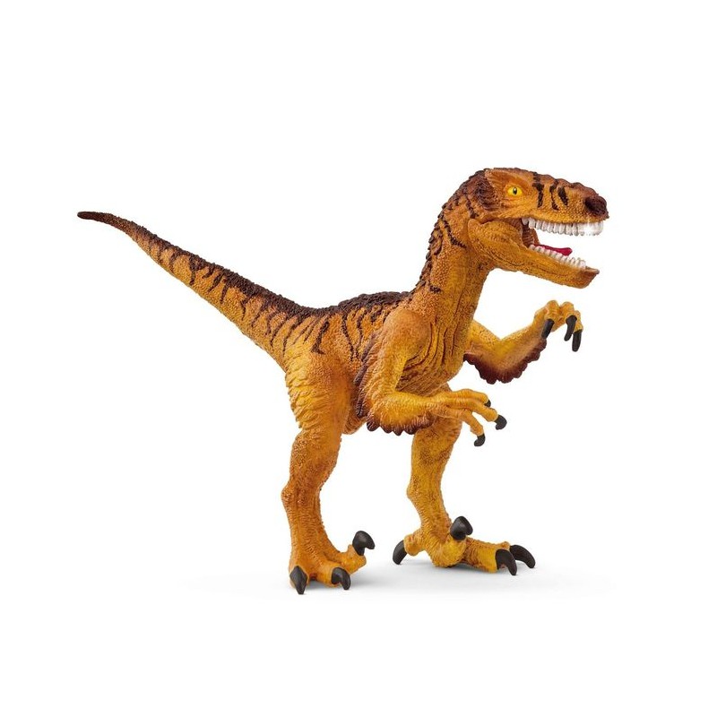 Ce vélociraptor de deux mètres de long se dresse sur ses pattes arrière et lève son museau plat vers le ciel pour flairer le vent. Il pousse un grondement menaçant, puis fait claquer sa puissante mâchoire plusieurs fois. Avec ses crocs acérés, il déchire tout ce qui passe entre ses griffes. Il s’élance et court à travers la plaine. Si sa peau de lézard est recouverte de plumes, il ne peut pourtant pas voler. Mais il est suffisamment rapide pour pourchasser ses proies de très près. Tous aux abris !