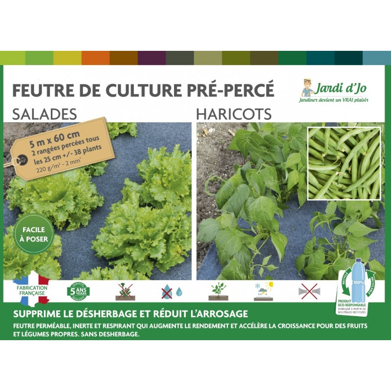 Pré-percé pour faciliter la plantation. Supprime le désherbage et l’emploi de produits chimiques. Conserve l’humidité, augmente le rendement et accélère la croissance des plants. Réduit l’arrosage. Perméable, inerte et résistant. Fabrication Française. 38 Plants|