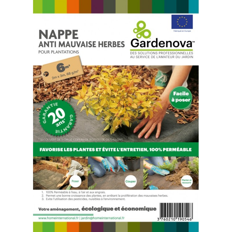 La Nappe Anti-Mauvaises Herbes, fabriquée en France, est une solution performante et respectueuse de l'environnement pour protéger vos massifs, bordures et sous-terrasses. Elle offre une barrière extrêmement résistante contre les mauvaises herbes, éliminant le besoin de désherbage et de produits chimiques. Sa perméabilité exceptionnelle à l’eau, à l’air et aux engrais favorise la santé des plantations, tout en étant conçue pour ne pas s’effilocher et résister à la déchirure. Pour une efficacité optimale, elle s’utilise avec 5 cm de copeaux de bois ou de gravillons. Recyclable et conçue pour durer, cette nappe est un allié incontournable pour vos aménagements extérieurs.|