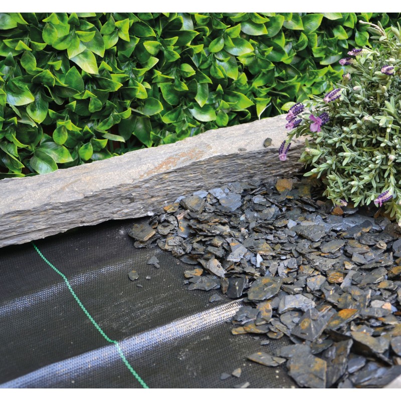 Evite la pousse des mauvaises herbes. Diminue les arrosages. Excellente rétention d’eau. Protection thermique des jeunes plants. Favorise la vie du sol. Traité anti-UV pour une mise en place durable. Sa technologie de fabrication lui donne une très bonne résistance mécanique.Toile tissée 100% polypropylène. 100% recyclable. Poids: 90g/m². Traitée anti-UV.Noire pour le paillis d’ardoise et blanche pour les graviers ou galets de marbre. Sa technologie de fabrication lui donne une très bonne résistance mécanique.