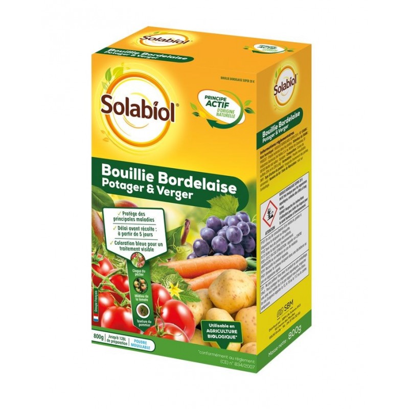 La Bouillie Bordelaise Potager et Verger Solabiol est un fongicide préventif de contact à base de sulfate de cuivre dont les vertus sont reconnues depuis longtemps et utilisable en jardinage biologique. La Bouillie Bordelaise est recommandée sur vigne. pomme de terre. légumes et arbres fruitiers.