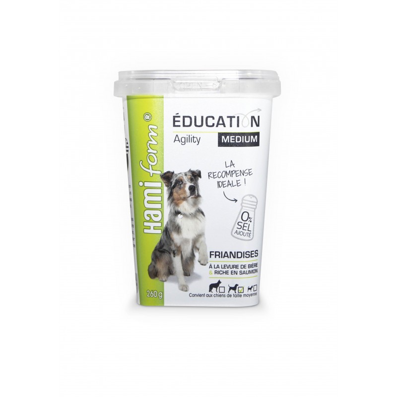 Aliment complémentaire pour chien.Les friandises Education Medium de chez HamiForm sont un mélange de tendres friandises pour chien en forme d?os.Votre chien va se régaler avec ces délicieuses friandises à la volaille, à l?agneau, à la panse ou au saumon, particulièrement adaptées pour l?entraînement, le sport et comme récompense. L?astucieuse ouverture de la boîte, vous permettra de lui distribuer sa récompense sans vous salir.