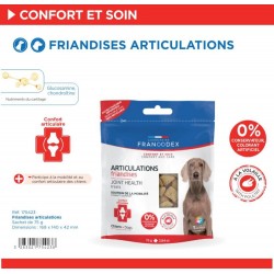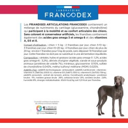 Les FRIANDISES ARTICULATIONS FRANCODEX contiennent un mélange de nutriments du cartilage (glucosamine, chondroïtine) qui participent à la mobilité et au confort articulaire des chiens. Sans colorant ni conservateur artificiels, les friandises contiennent également des acides gras omega 3 et omega 6 et des vitamines A, D3 et E.