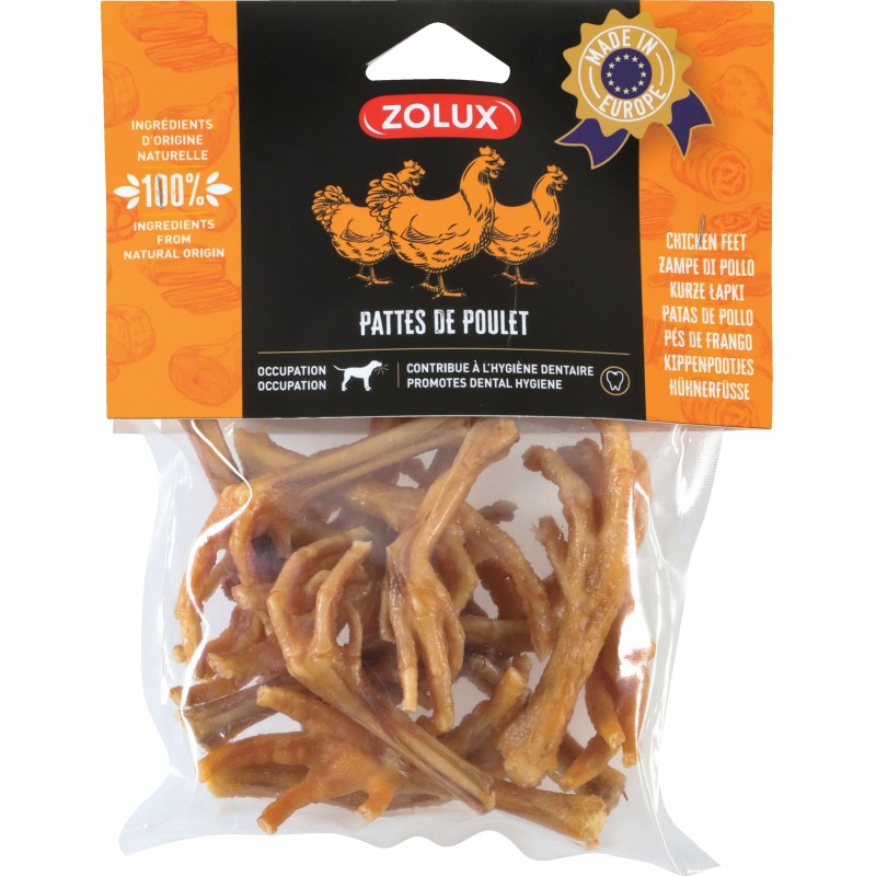 100% naturelles et source de protéines, les pattes de poulet sont la collation idéale pour une longue séance de mastication et un moyen très efficace de réduire les tensions de votre animal. C'est une aide idéale pour l'entretien de sa dentition. Grâce à sa texture rigide et à ses aspérités, votre chien pourra facilement nettoyer ses dents et ses gencives.|