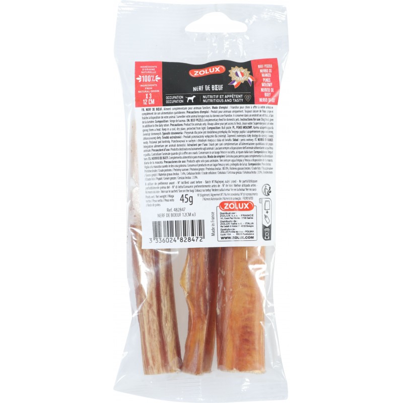 Très gourmand, le nerf de boeuf comble le besoin de mastiquer intense des chiens. Cette friandise favorise le travail des muscles de la mâchoire, et participe à la lutte contre la plaque dentaire. Cette friandise tiendra votre chien occupé, et permettra d’apaiser son stress ou de combler son ennui.|