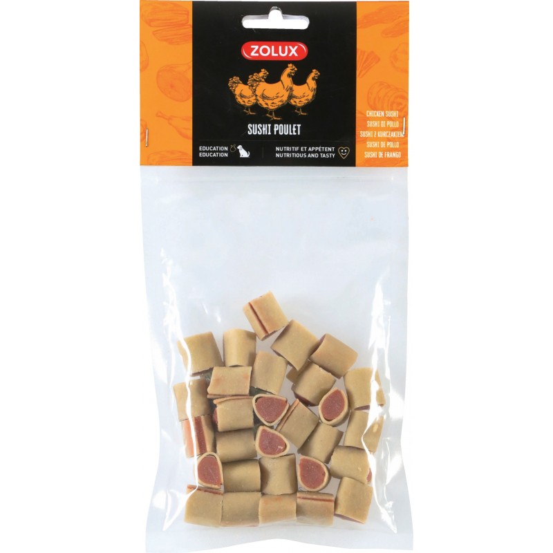 Les savoureux sushis au poulet sont composés de délicieux filets de poulet dans de tendres lamelles de poisson. Très appétents, ces friandises feront le régal de votre compagnon.|