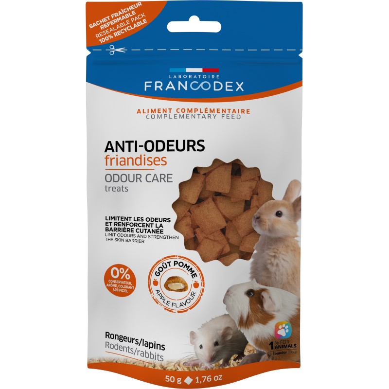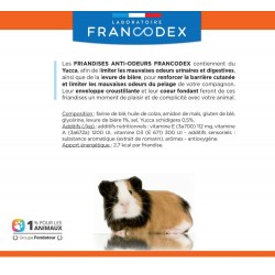 Les FRIANDISES ANTI-ODEURS FRANCODEX contiennent du Yucca, afin de limiter les mauvaises odeurs urinaires et digestives, ainsi que de la levure de bière, pour renforcer la barrière cutanée et limiter les mauvaises odeurs du pelage de votre compagnon. Leur enveloppe croustillante et leur coeur fondant feront de ces friandises un moment de plaisir et de complicité avec votre animal.