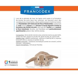CONSEILS D'UTILISATION: Lapin < 1 kg: 3 friandises par jour Lapin > 1 kg: 5 friandises par jour. Il est préférable d'attendre la fin de la période de sevrage (10 semaines d'âge) avant de donner ces friandises. Toujours associer à un brossage quotidien pendant la période de mue afin de limiter l'ingestion de poils par l'animal. Cet aliment complémentaire ne doit pas se substituer à une alimentation équilibrée. Utiliser dans le mois suivant l'ouverture. Mettre à disposition de l'eau fraiche à volonté. Tenir hors de portée des enfants. À conserver dans un endroit frais et sec. Produit non destiné à la consommation humaine.