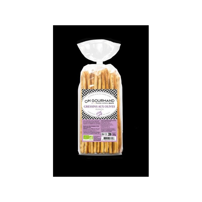 Gressins Rubata bio aux olives. fabriqués en Italie en respectant la tradition. Parfait pour accompagner tous les apéritifs et les pauses gourmandes !|