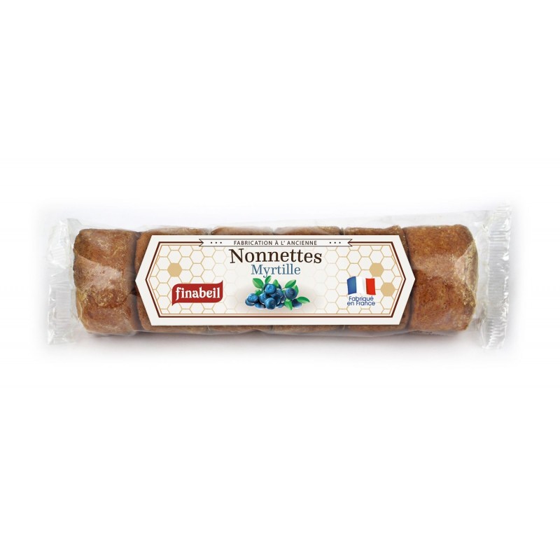 Farine de froment (blé), confiture de myrtille 26% (sucre, sirop de glucose-fructose, myrtilles 35%*, gélifiant (pectines), correcteurs d?acidité (acide citrique, citrate trisodique)), miel 21%, sirop de sucre inverti, sucre, poudres à lever (carbonates de sodium, carbonates d?ammonium), jaunes d??ufs, arôme naturel d?orange.*% exprimé sur la confiture.