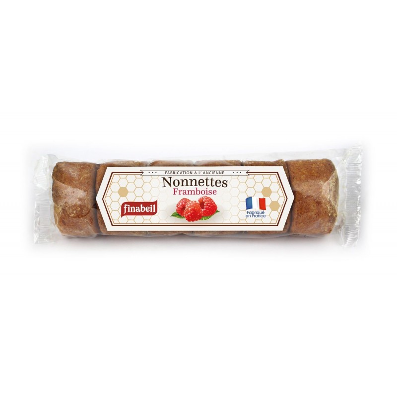 Farine de froment (blé), confiture de framboise 26% (sucre, framboise 35%*, sirop de glucose-fructose, gélifiant (pectines), correcteurs d?acidité (acide citrique, citrate trisodique)), miel 21%, sirop de sucre inverti, sucre, poudres à lever (carbonates de sodium, carbonates d?ammonium), jaunes d??ufs, arôme naturel d?orange.*% exprimé sur la confiture.
