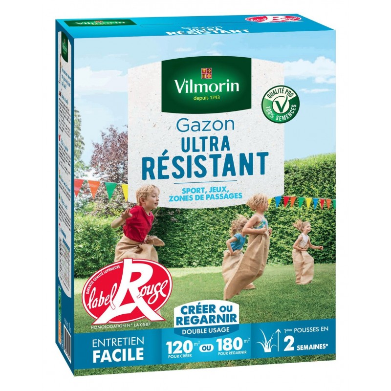 Jouez, courez, marchez, sautez! Vilmorin a conçu ce gazon ultra résistant adapté aux usages intensifs et formant rapidement un tapis végétal dense et résistant. Profitez à fond de votre gazon !