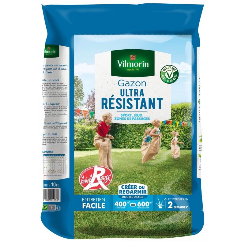Jouez, courez, marchez, sautez! Vilmorin a conçu ce gazon ultra résistant adapté aux usages intensifs et formant rapidement un tapis végétal dense et résistant. Profitez à fond de votre gazon !|