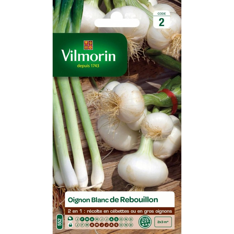 Semé au printemps, l'oignon Rebouillon se récolte jeune et vert. C'est alors un oignon cébette. Semé en fin d´été, il se récolte à partir de mai, en gros bulbes demi-ronds d'une taille allant jusqu'à 9 cm de diamètre et de couleur gris argenté. De très bonne conservation, cet oignon tardif et de jours longs résiste bien à la montée à graines.|