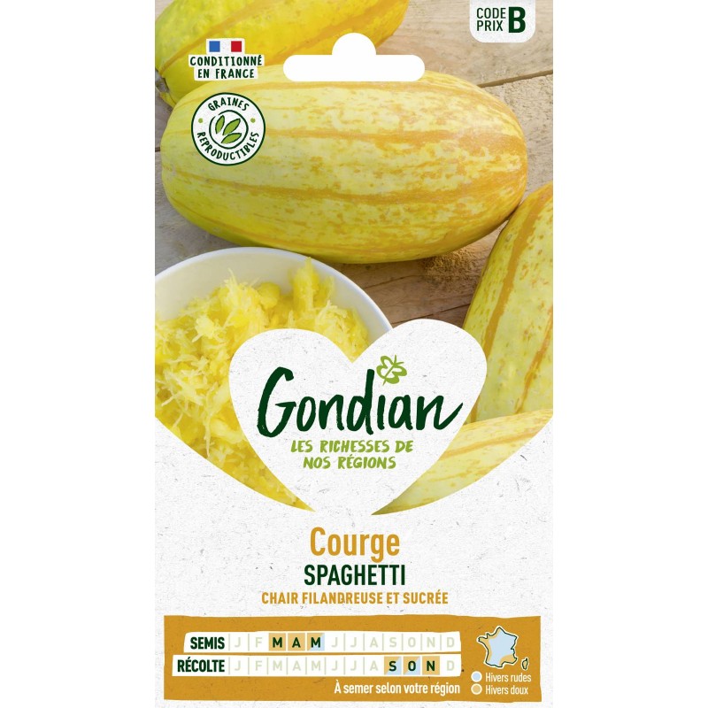 Cette courge à port rampant. aux fruits allongés. jaune orangé à maturité. est facile à cultiver. La chair filandreuse est très originale : après cuisson. elle prend la forme de véritables 'spaghetti'. pouvant se consommer comme ces derniers et dont le goût est délicieux. |