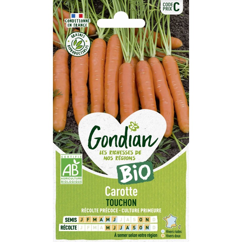 Carotte traditionnelle de France. la Touchon se récolte de façon précoce car elle peut être semée dès le mois de janvier dans les régions à hivers doux. Cette variété propose des racines orange rougeâtre. lisses et à bout bien rond (dit 'obtus') et une chair sucrée.|