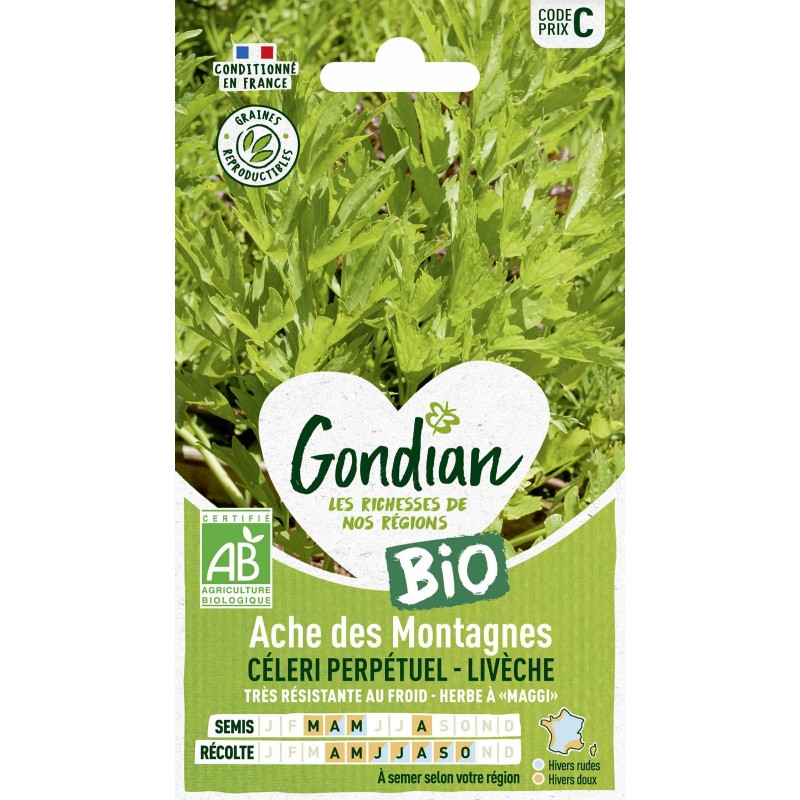 Originaire d'Iran. cette plante. connue pour son fort parfum de céleri. peut atteindre 2 mètres de hauteur durant sa floraison. Ses larges feuilles aromatisent soupes. sauces et plats mijotées. ou se consomment cuites à la vapeur. Broyées avec les racines. elles servent à la confection du sel de céleri.|