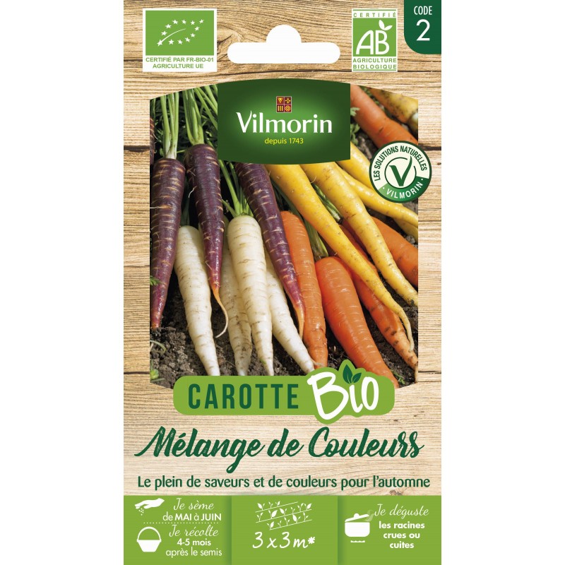 Un mélange de 4 variétés anciennes, riche en couleurs et en formes. Il contient des carottes oranges, jaunes, blanches et violettes pour le plaisir des yeux mais également pour varier les saveurs. Des variétés à la récolte automnale et de bonne conservation hivernale.|