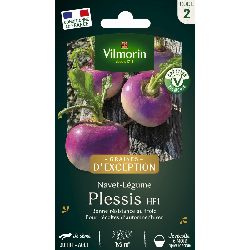 Découvrez également la variété Plessis HF1, offerte dans ce sachet! Elle est exceptionnelle et s'adapte à tous les terrains. Ses nombreuses résistances et son très bon comportement au froid la rendent facile à réussir. Les navets obtenus sont parfaitement ronds, homogènes et de très bonne qualité.|