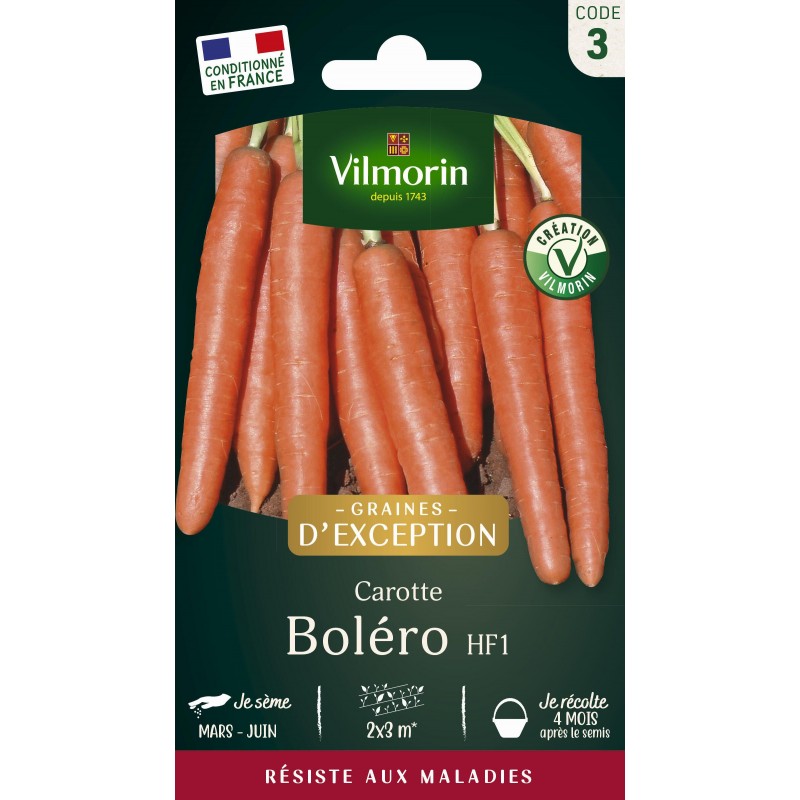 Cette variété hybride est très facile à cultiver grâce à sa rusticité, sa vigueur et ses résistances aux principales maladies de la carotte. Tolérante au froid et possédant une bonne conservation dans le sol, elle est idéale pour des récoltes d'automne-hiver. Elle donne de délicieuses carottes à la saveur sucrée, de 18-20 cm de long.|
