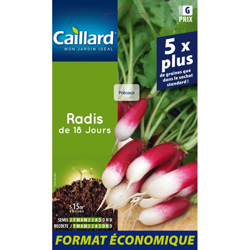 Radis demi-long, rose vif à bout blanc. Variété précoce pour culture sous abri ou pleine terre.|