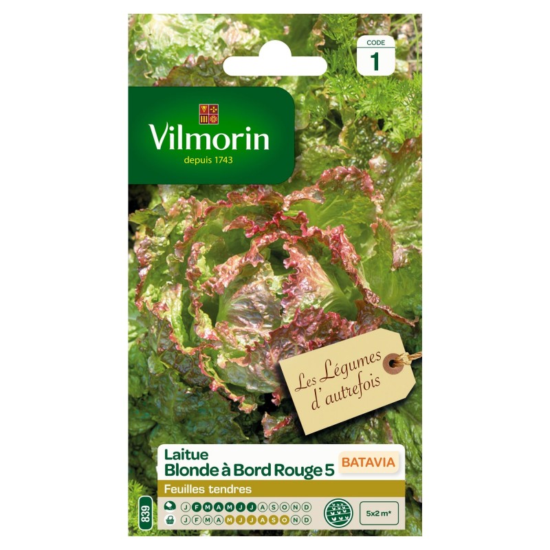 Variété donnant de belles salades aux feuilles croquantes, avec le bord coloré de rouge.