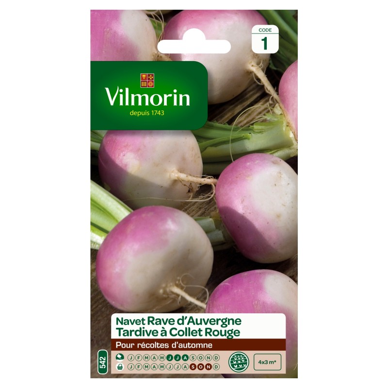 Cette variété, tardive et très productive, vous donnera de grosses racines demi-aplaties, violettes et blanches.