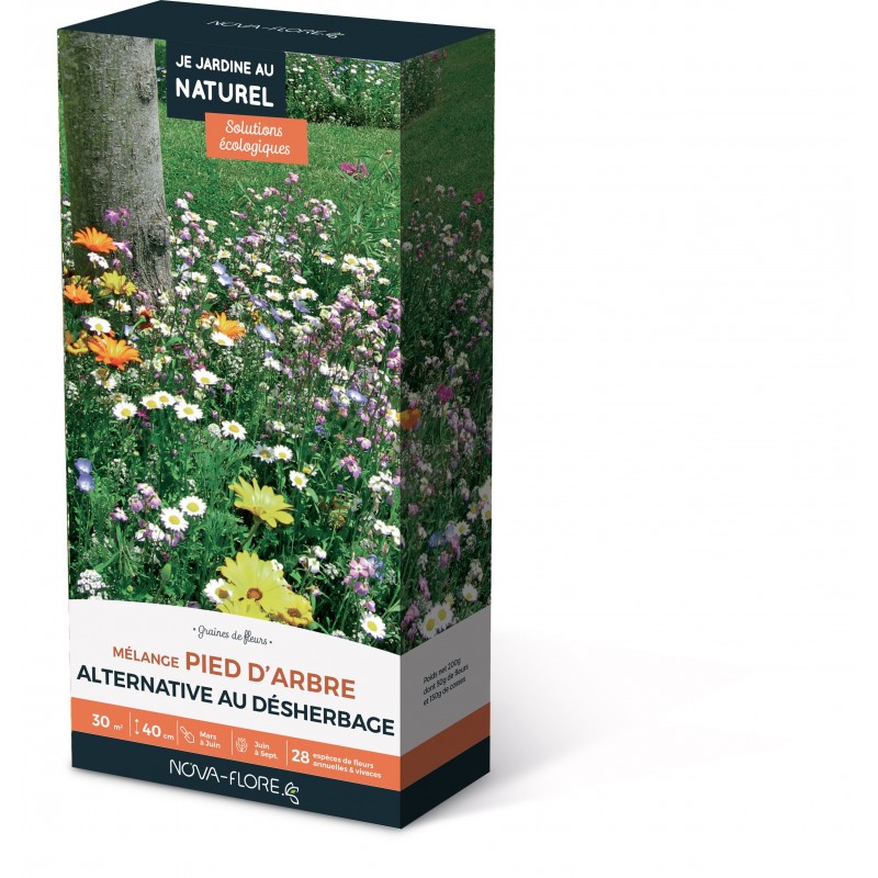 Sélection de fleurs très résistantes, capables de repousser en fin de saison estivale, ce mélange pied d’arbre est une alternative au désherbage du pied des arbres. Il facilite également la tonte autour des arbres et protège le collet des blessures provoquées par les tondeuses.|