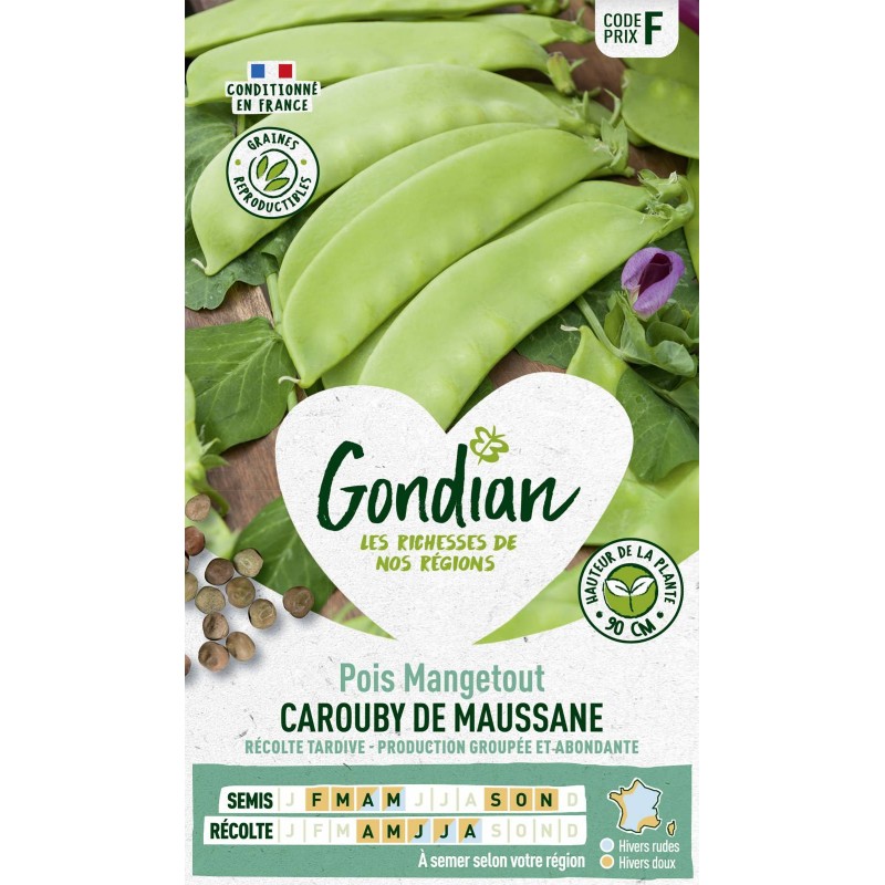 Cette variété produit des cosses longues. plates. légèrement arquées. à peau vert brillant et au goût très sucré. Ses grains sont bruns tachetés de violet. Productive. elle offre une récolte groupée. Ce pois se consomme aussi bien cru que cuit.|