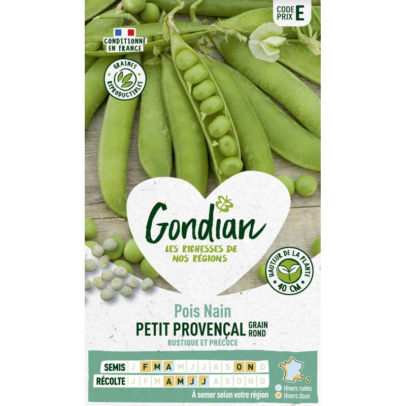 Cette variété traditionnelle. précoce. est adaptée aux cultures de fin de saison. Elle produit des cosses arquées. contenant 8-9 gros grains. tendres et savoureux. Résistant au froid. ce pois peut se semer à l'automne dans les régions à hiver doux. |