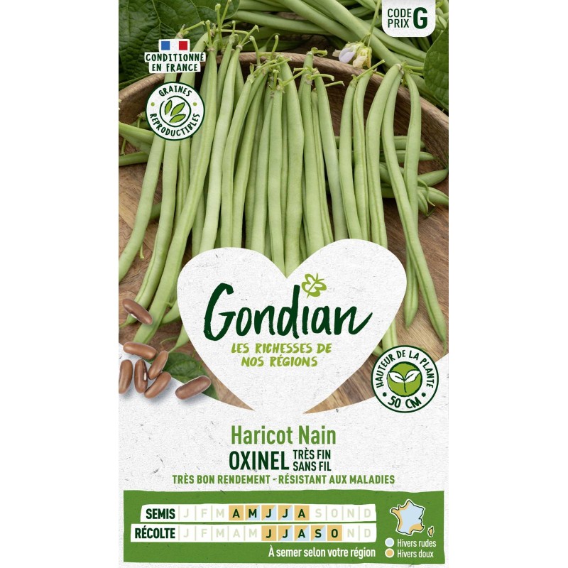 Oxinel. variété incontournable du potager. issue d'une sélection rigoureuse. réunit toutes les caractéristiques d'un grand haricot : rendement. résistance aux maladies. goût. absence de fil. |