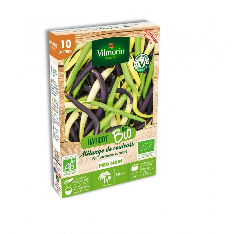 Un mélange de 3 variétés de haricots nains pour un somptueux mélange de saveurs et de couleurs. Des variétés productives aux gousses charnues, de couleur verte, jaune et violette.|